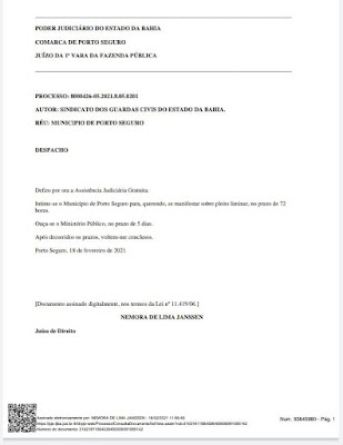 Após entrar com um pedido de liminar no dia 17/02/2021 no Tribunal de Justiça da Bahia, contra o edital 001/2021 da prefeitura de Porto Seguro, onde abria seleção simplificada com contrato de um ano para Guarda Municipal, a justiça deferiu um prazo de 72 horas para a prefeitura da explicação sobre a irregularidade apontada pelo SINDGUARDAS/BA.