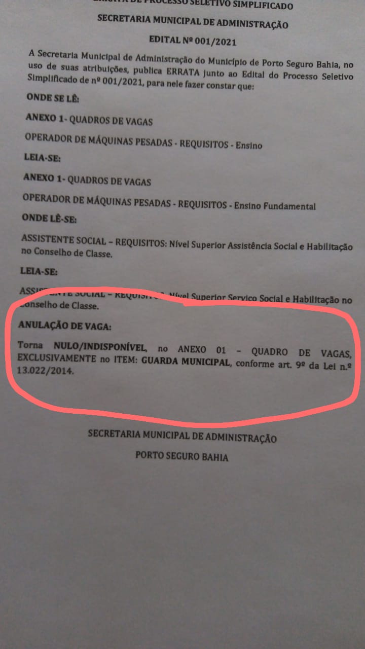Ao tomar conhecimento da ação sindical, a prefeitura emitiu uma ERRATA junto ao edital 001/2021 tornando nulas as vagas que seria destinada a Guarda Municipal, citando como referencia o artigo 9º da Lei federal 13.022/2014.