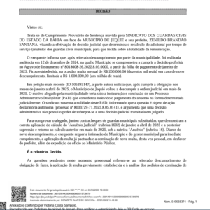 O prefeito protocolou petição informando que irá cumprir integralmente a decisão. Além disso, já anexou aos autos a comprovação da projeção de pagamento referente a este mês. Portanto, a medida passa a ter efeitos imediatos, trazendo impacto direto na remuneração dos guardas civis municipais a partir de março.