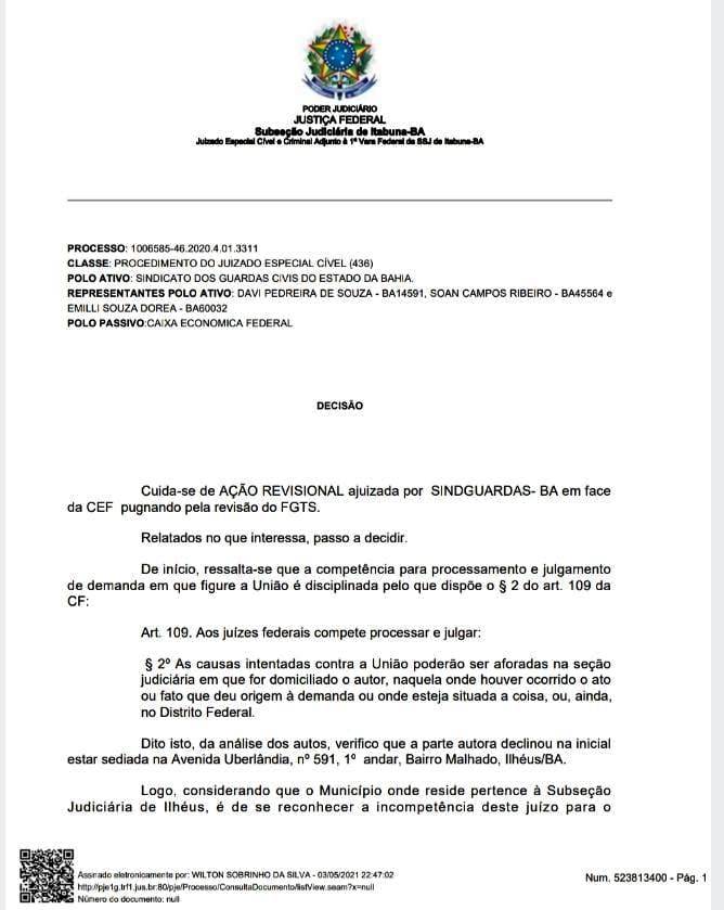 Segue a petição inicial do processo de número da Vara da 1006585-46.2020.4.01.3311, bem como a decisão do juiz que remeteu a ação para ser julgada na Vara Federal de Ilhéus.