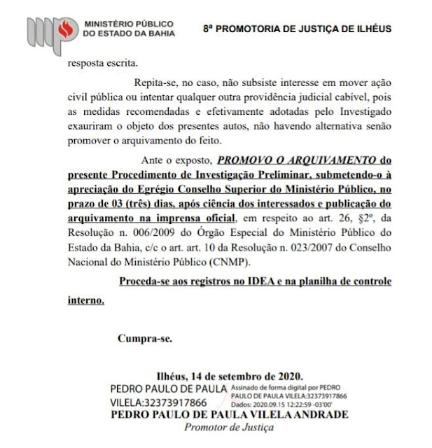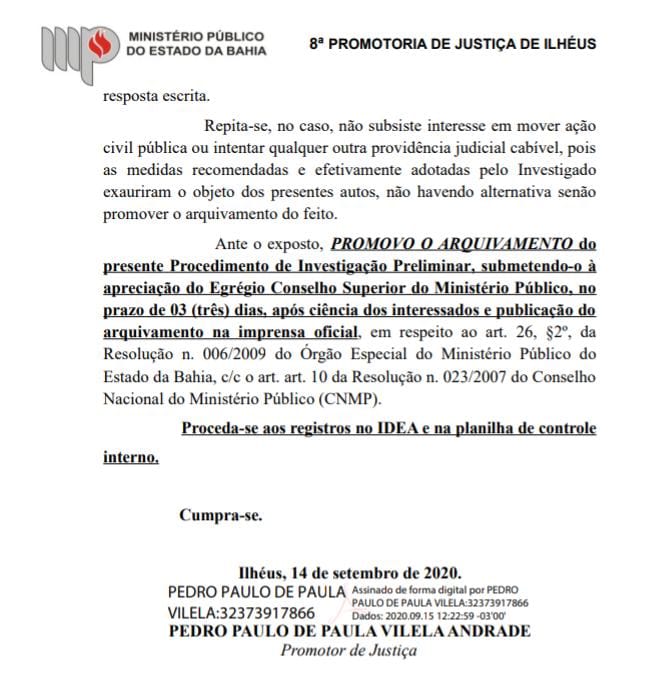 Após a revogação do Pregão Presencial por parte da Prefeitura Municipal de Ilhéus, na época gerida pelo Prefeito Jabes Ribeiro, cumprindo assim a Recomendação do MP, o órgão ministerial arquivou o Inquérito Civil instaurado com a denuncia do Sindicato.