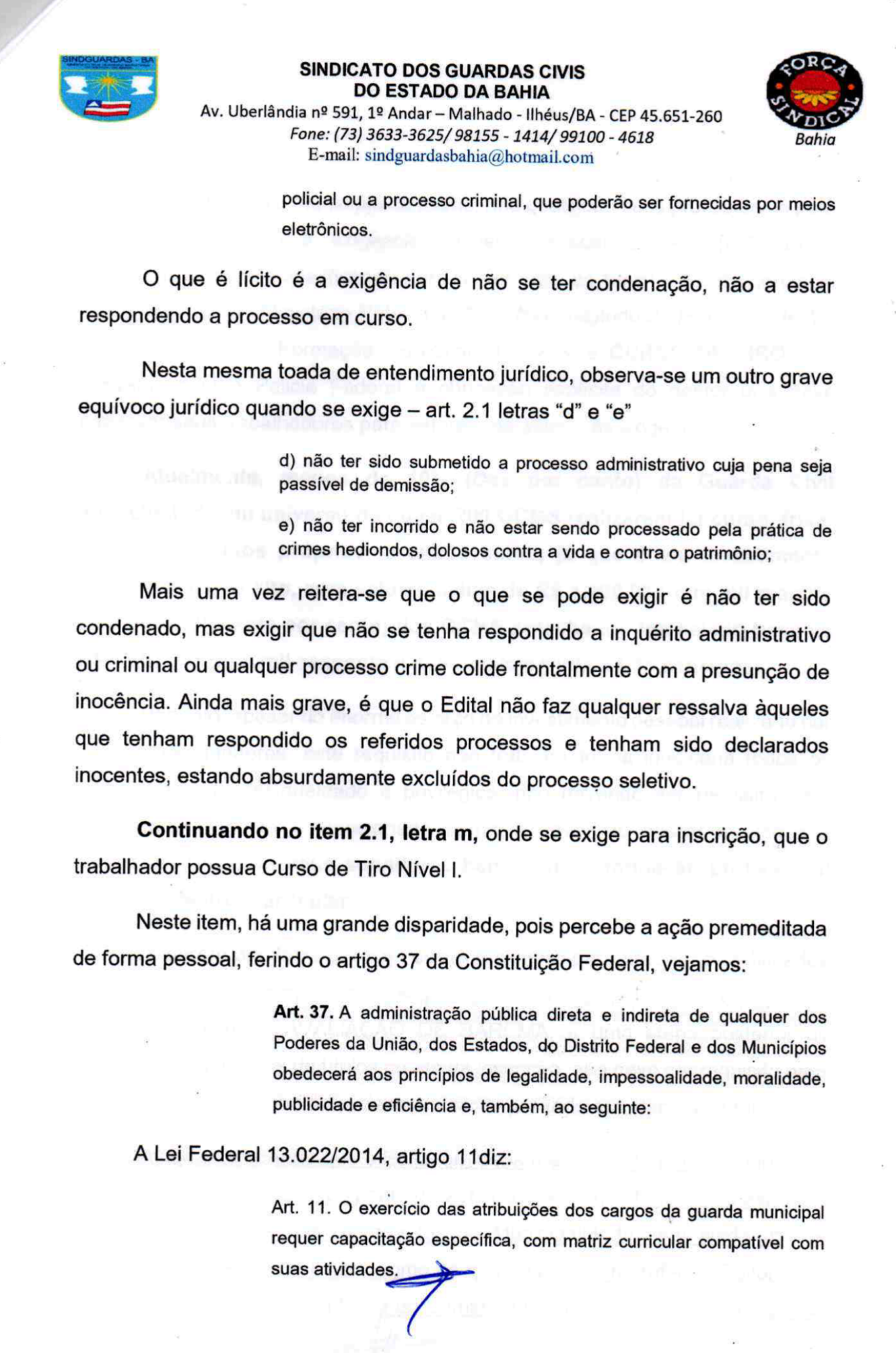 O Sindicato dos Guardas Civis do Estado da Bahia (SINDGUARDAS/BA) protocolou oficio endereçado ao prefeito Mario Alexandre ao secretario de Administração e ao Procurador Jurídico do Município de Ilhéus solicitando a retificação do edital 001/2020, elaborado e publicado pelo comandante da Guarda Civil Municipal de Ilhéus, Leonardo Bandeira.